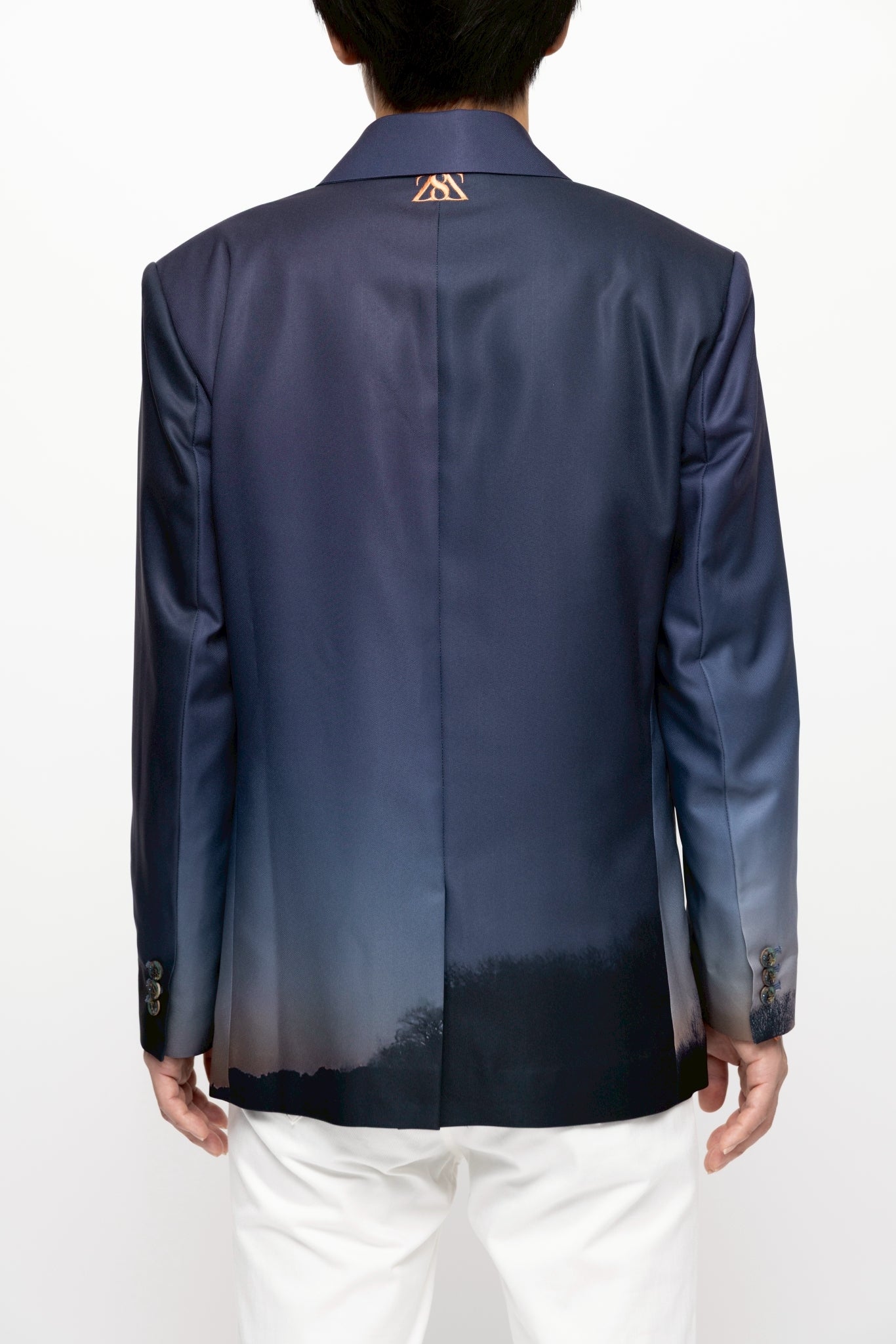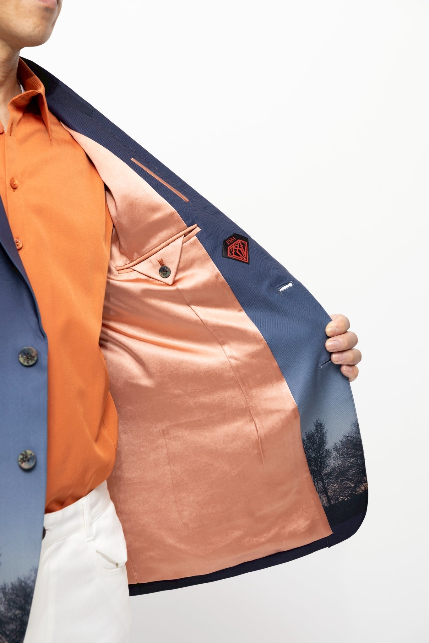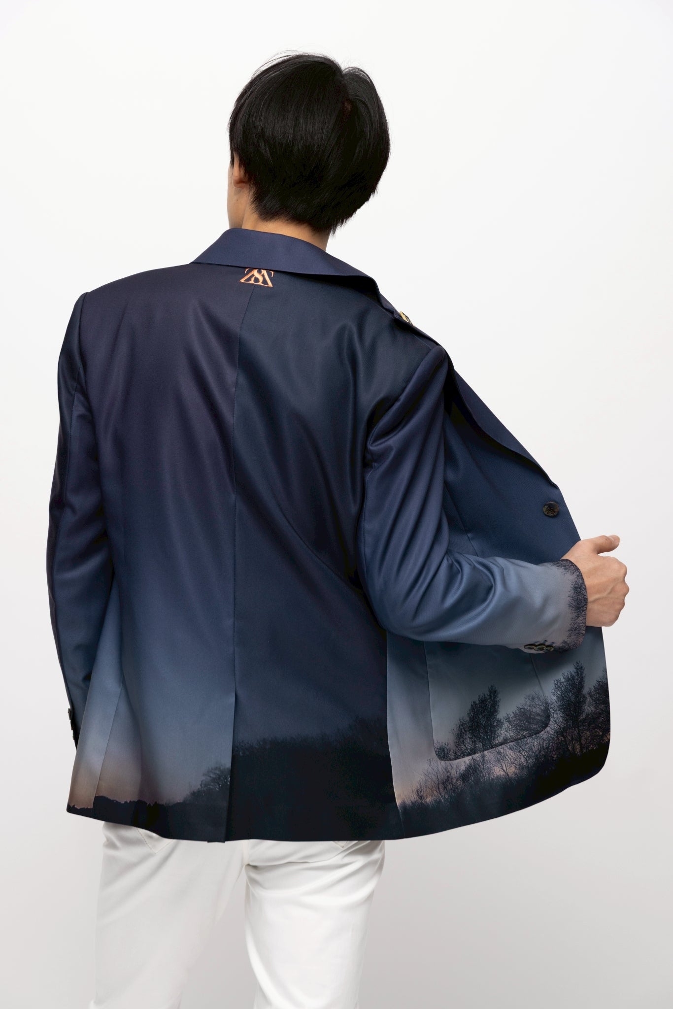 日常へ”瞬間的にラグジュアリー”を差し込む、Z8Zの解釈によるテーラード。京都で撮影された夕暮れ後の空を写し取った「京空」のモチーフは、淡いブルーから深いネイビーへと移ろう静かなグラデーションで、装いに洗練された奥行きを与えます。