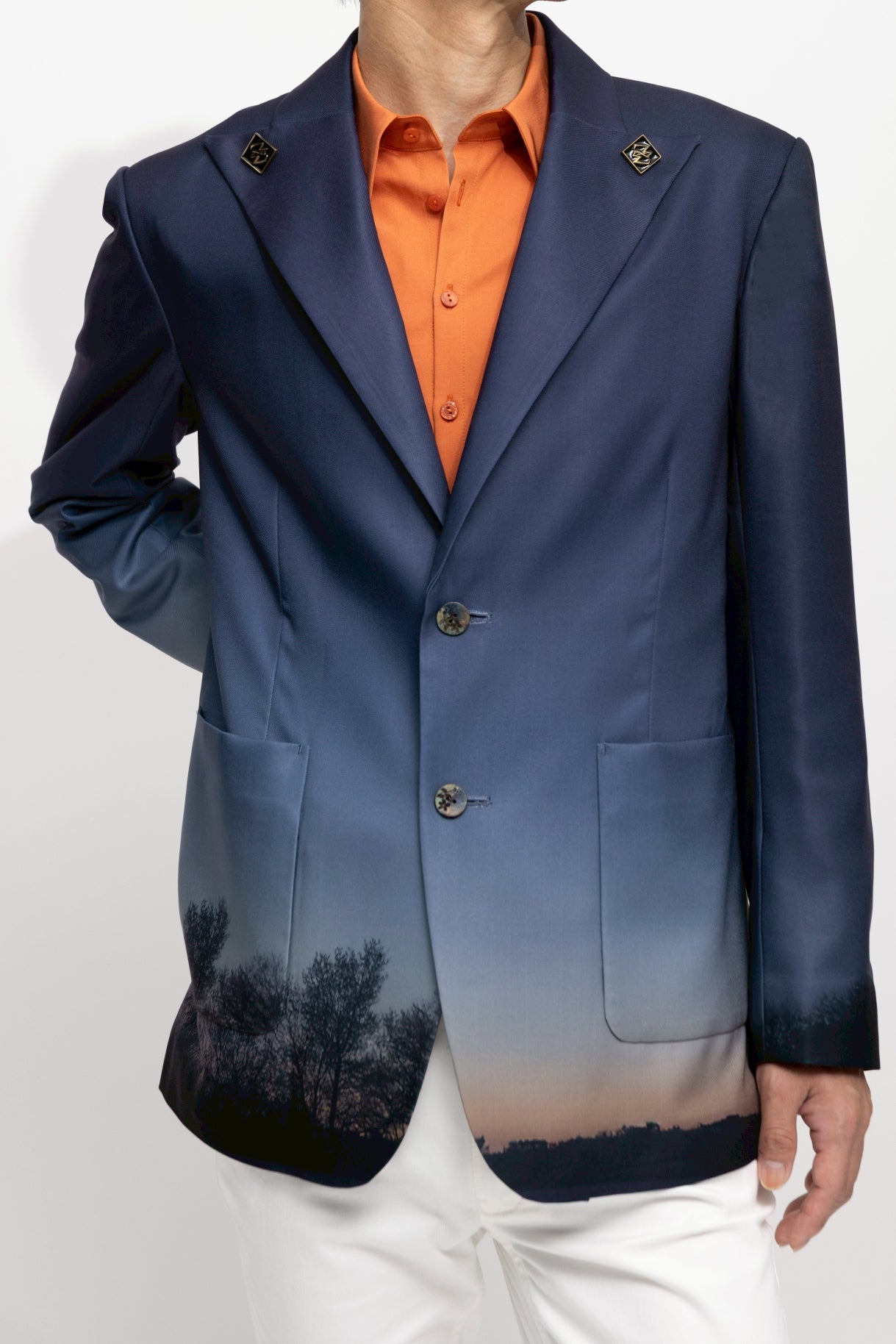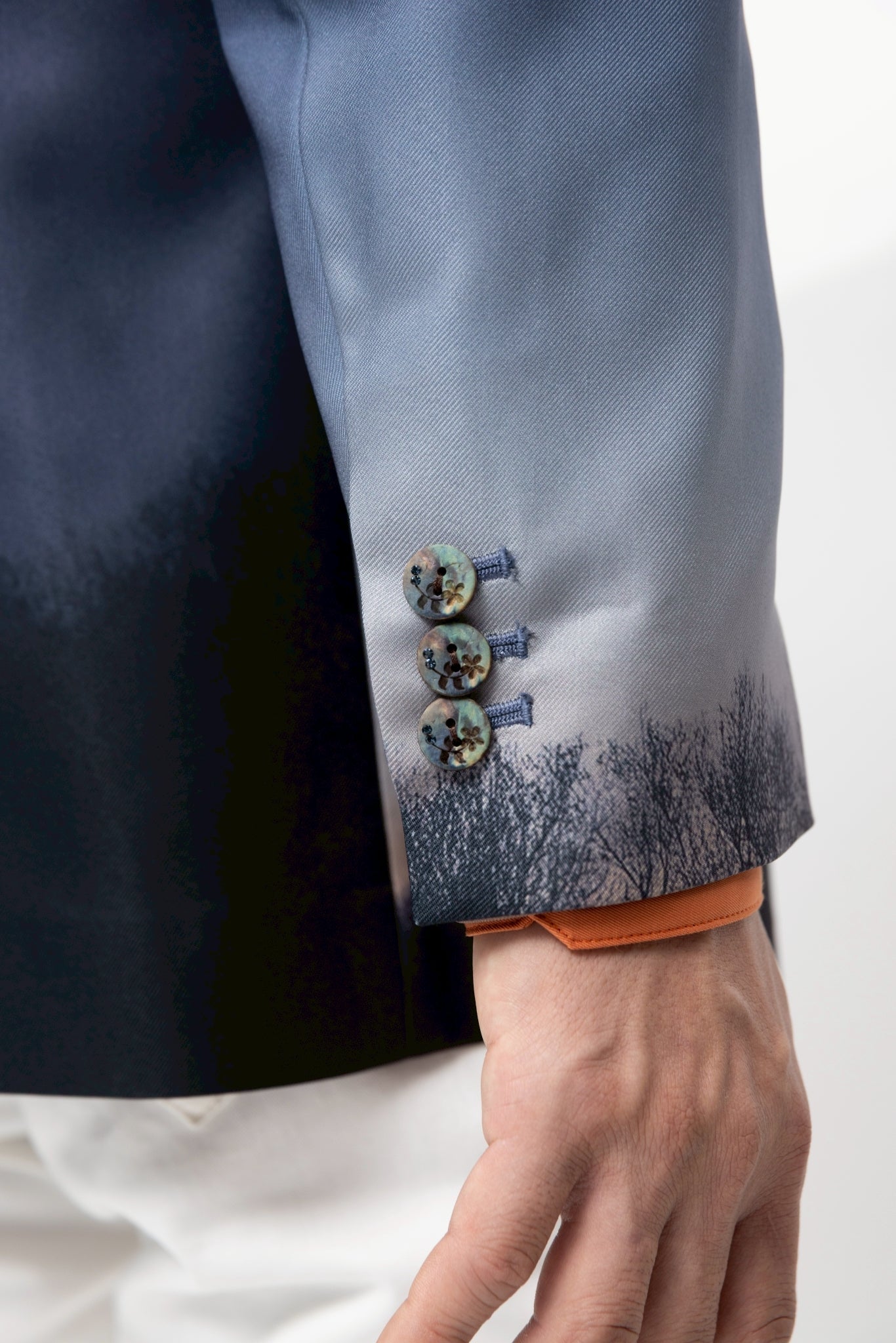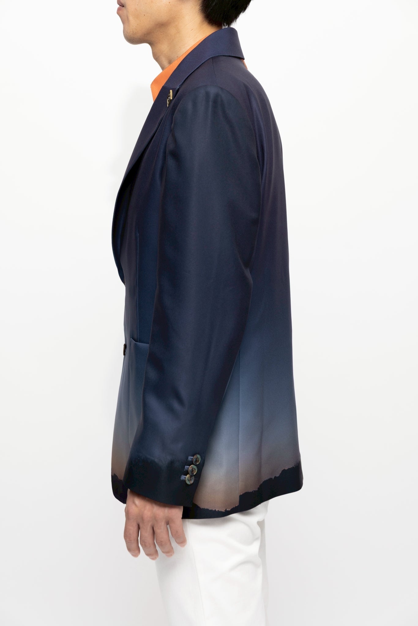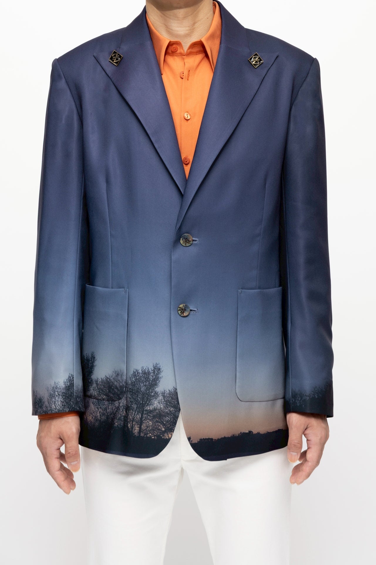 日常へ”瞬間的にラグジュアリー”を差し込む、Z8Zの解釈によるテーラード。京都で撮影された夕暮れ後の空を写し取った「京空」のモチーフは、淡いブルーから深いネイビーへと移ろう静かなグラデーションで、装いに洗練された奥行きを与えます。