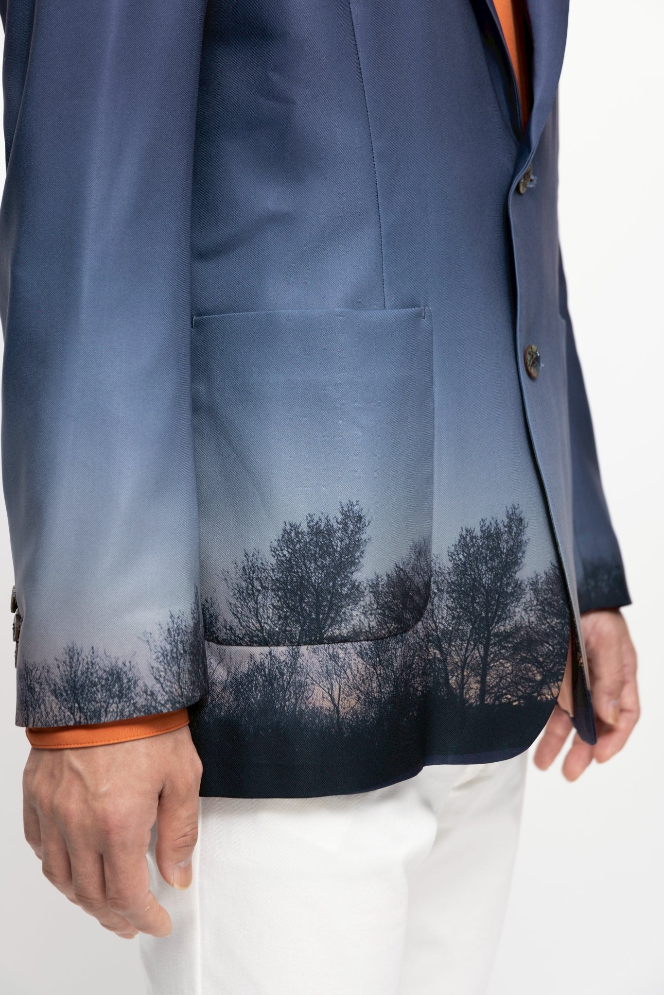 ・夕暮れの空と木々のシルエットをモチーフにした全面グラフィックプリント。