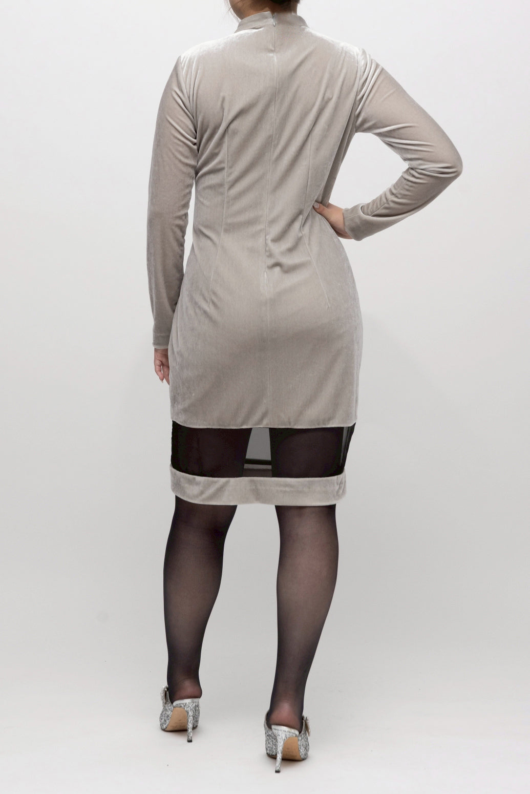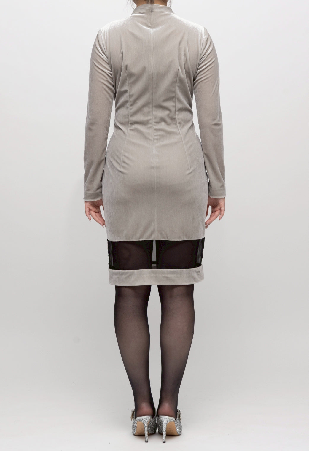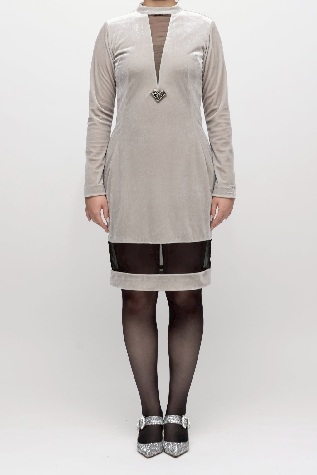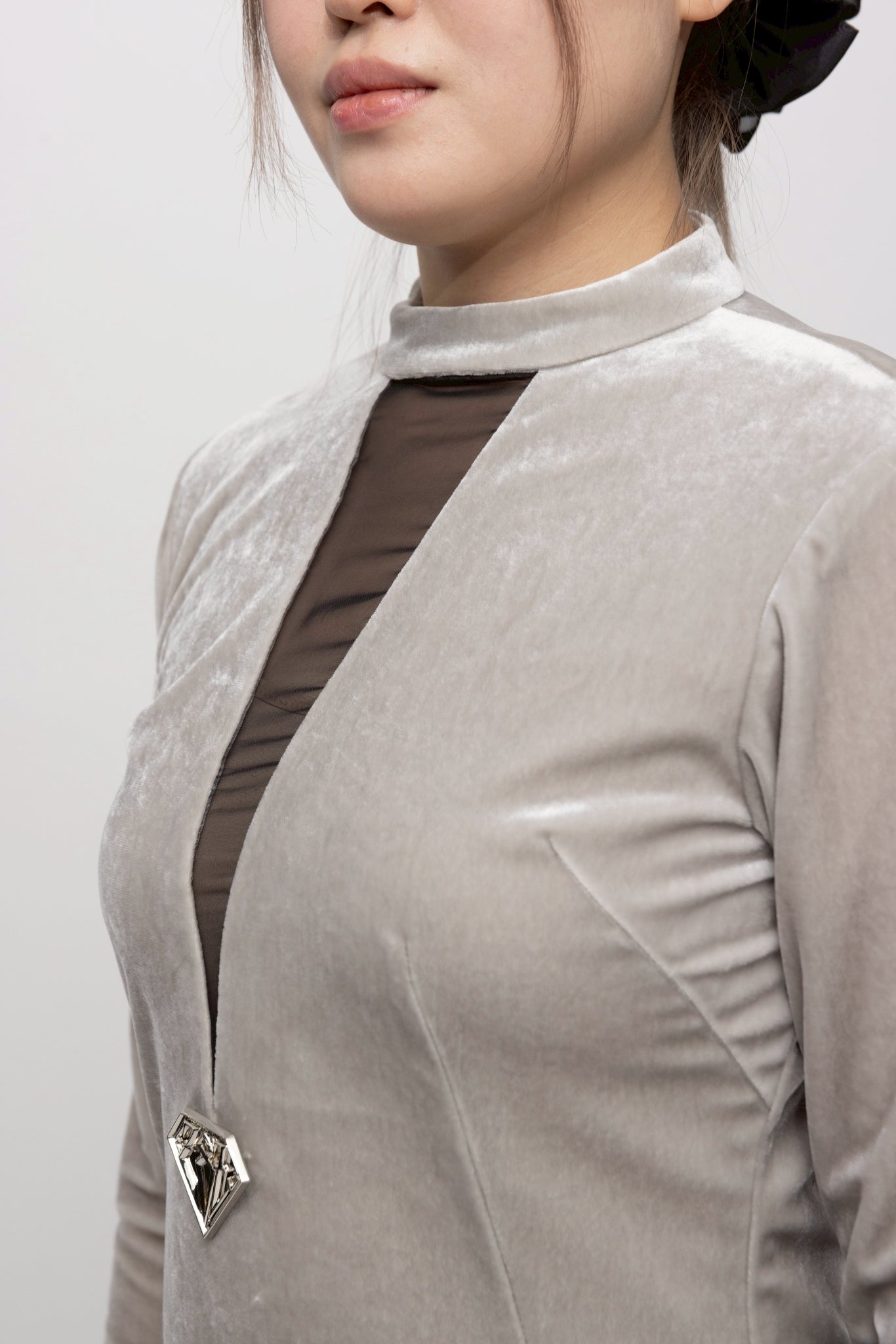 ・ハイネックの襟元から深V字に切り込まれたシアー素材が覗き、顔周りをシャープに引き立てます。