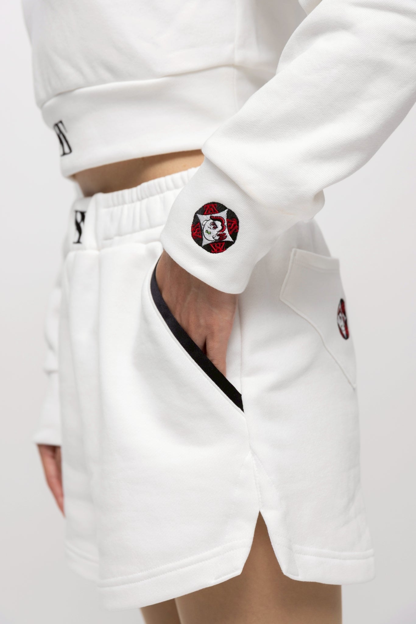 ・クロップドトップスとのセットアップ着用時、肌を覗かせる部分にロゴが配置され、高揚感とファッショナブルな感性を引き出します。